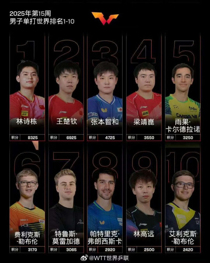 据悉,4月8日,@WTT世界乒联发布国际乒联2025年第15周世界排名。男子单打,林诗栋保持排名第一。